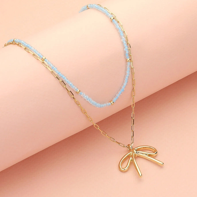 Metal Bow Pendant Seed Beaded Paperclip Chain Layered Necklace.
