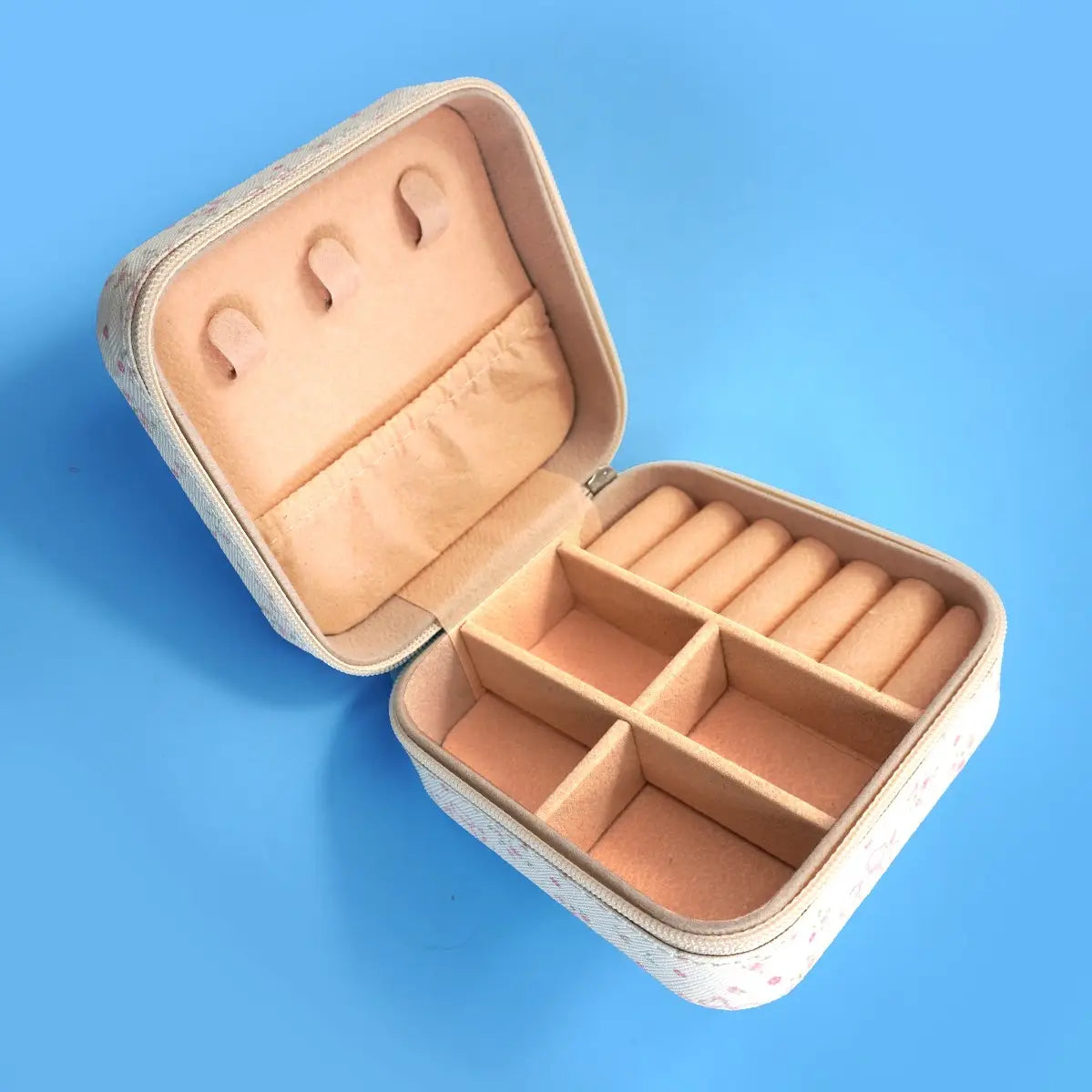 Jewelry Organizer Travel Box Case, the ultimate solution for keeping your jewelry safe, organized, and tangle-free while on the go. It features three necklace hooks, ring slots, and adjustable slots for added organization. Zipper closure.