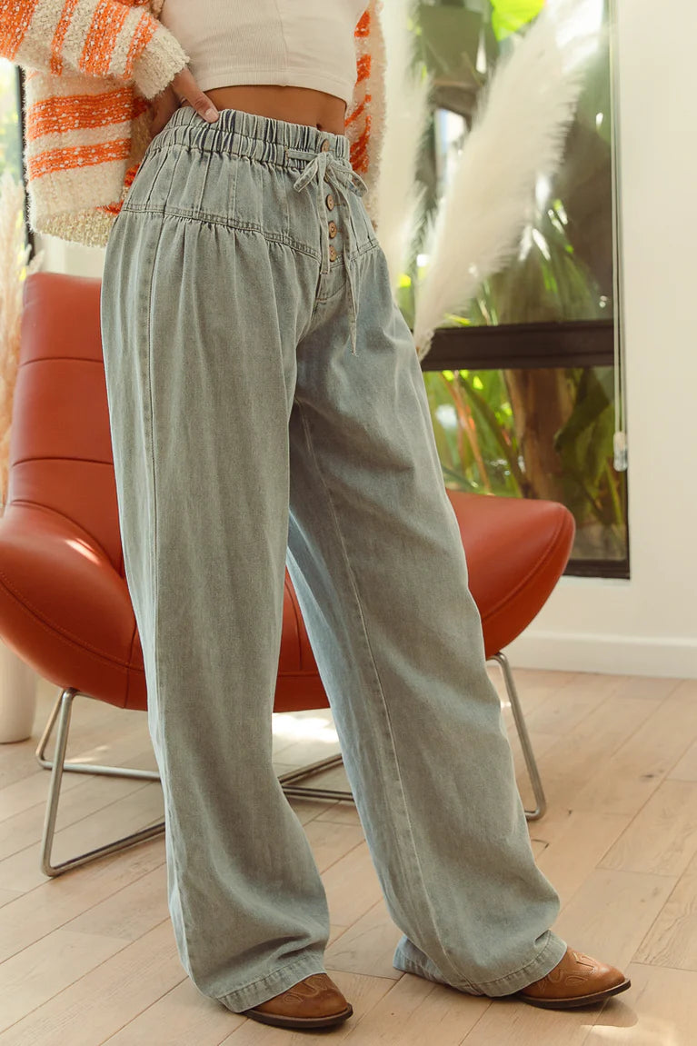 These wide-leg denim pants offer the perfect mix of comfort and style. With an elastic waistband and functional drawstring for a customizable fit. The button closure adds a classic touch, while the relaxed, wide-leg silhouette ensures all-day comfort and a flattering shape. Ideal for dressing up or down, these pants are a versatile addition to your wardrobe.