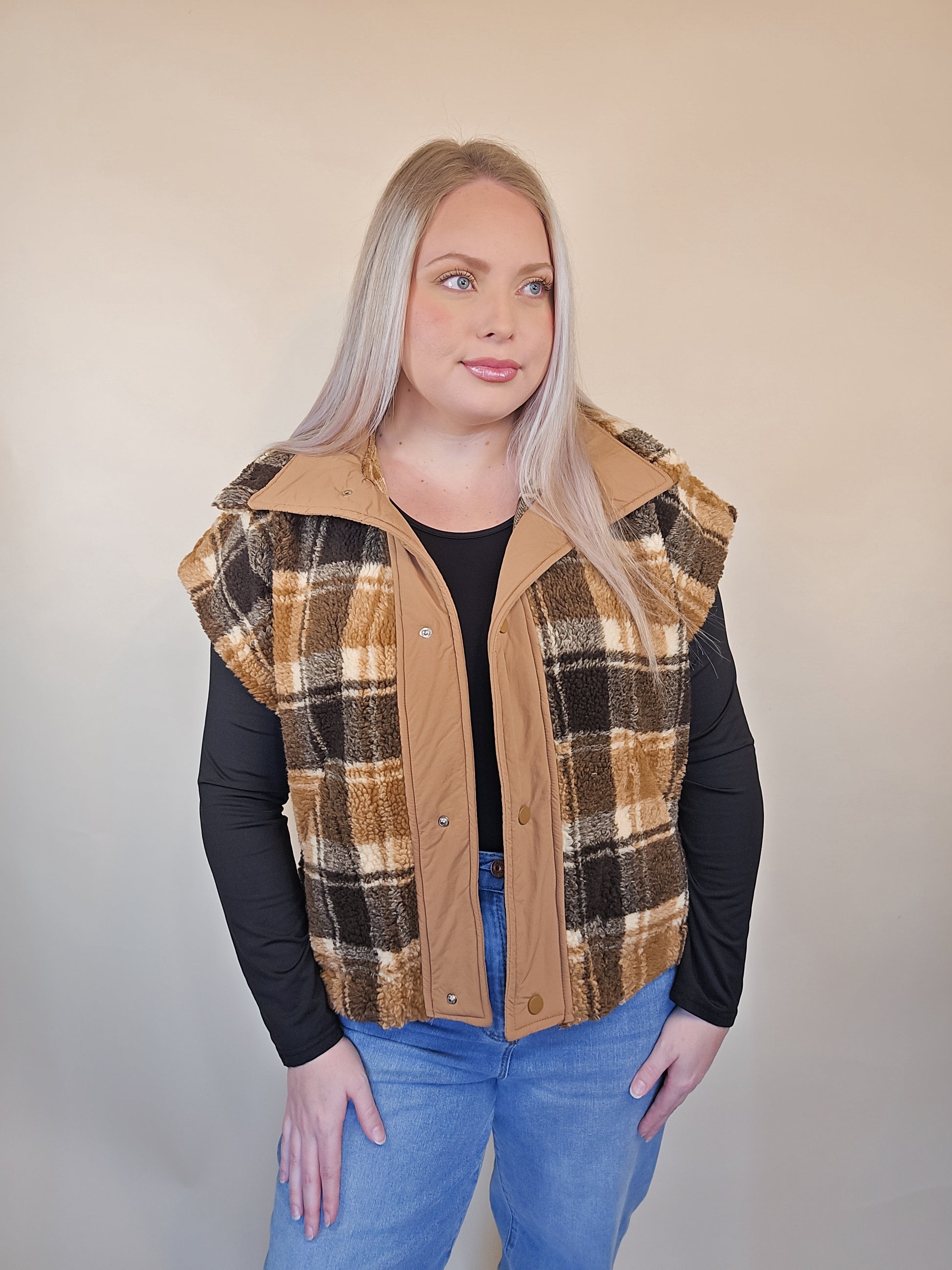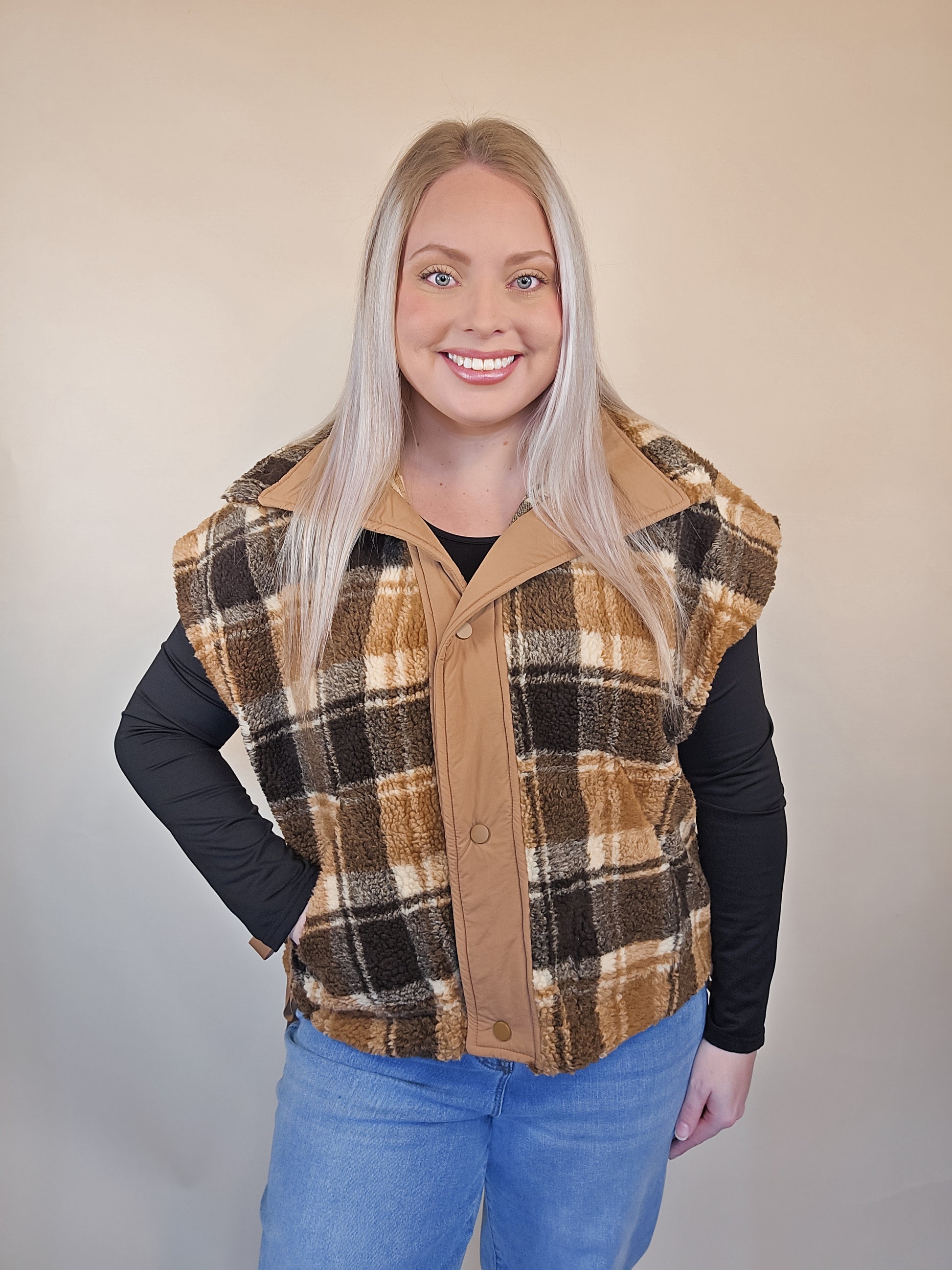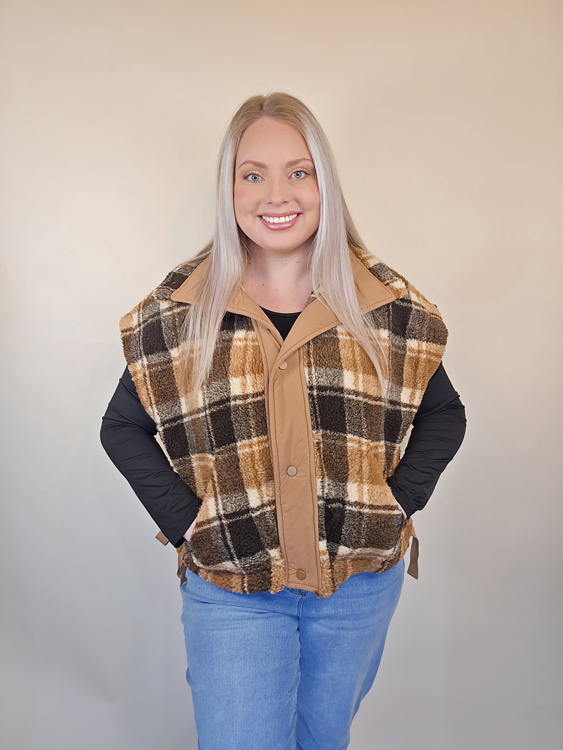 Meet your new layering essential. This sherpa plaid sweater vest features snap button detailing, functional pockets, and adjustable side ties for a customizable fit. Finished with a comfy, boxy silhouette that layers effortlessly over your everyday basics while keeping things warm and chic.