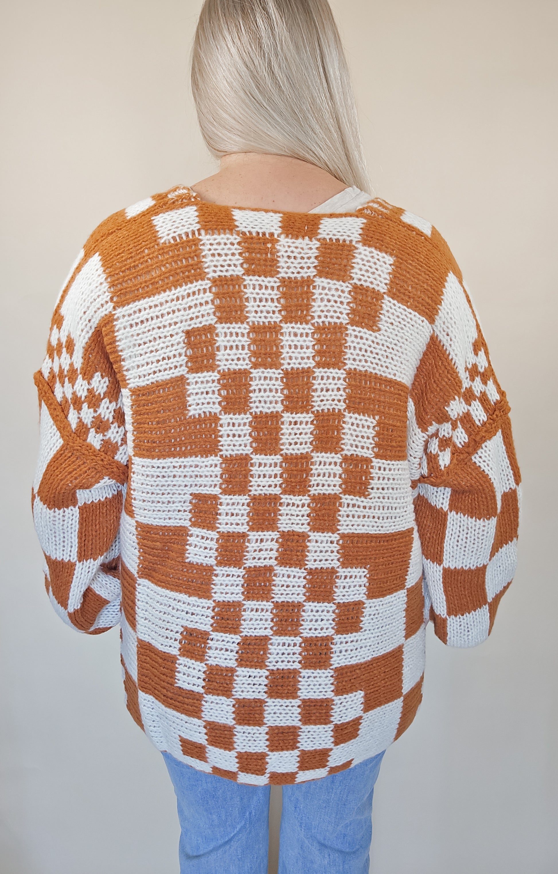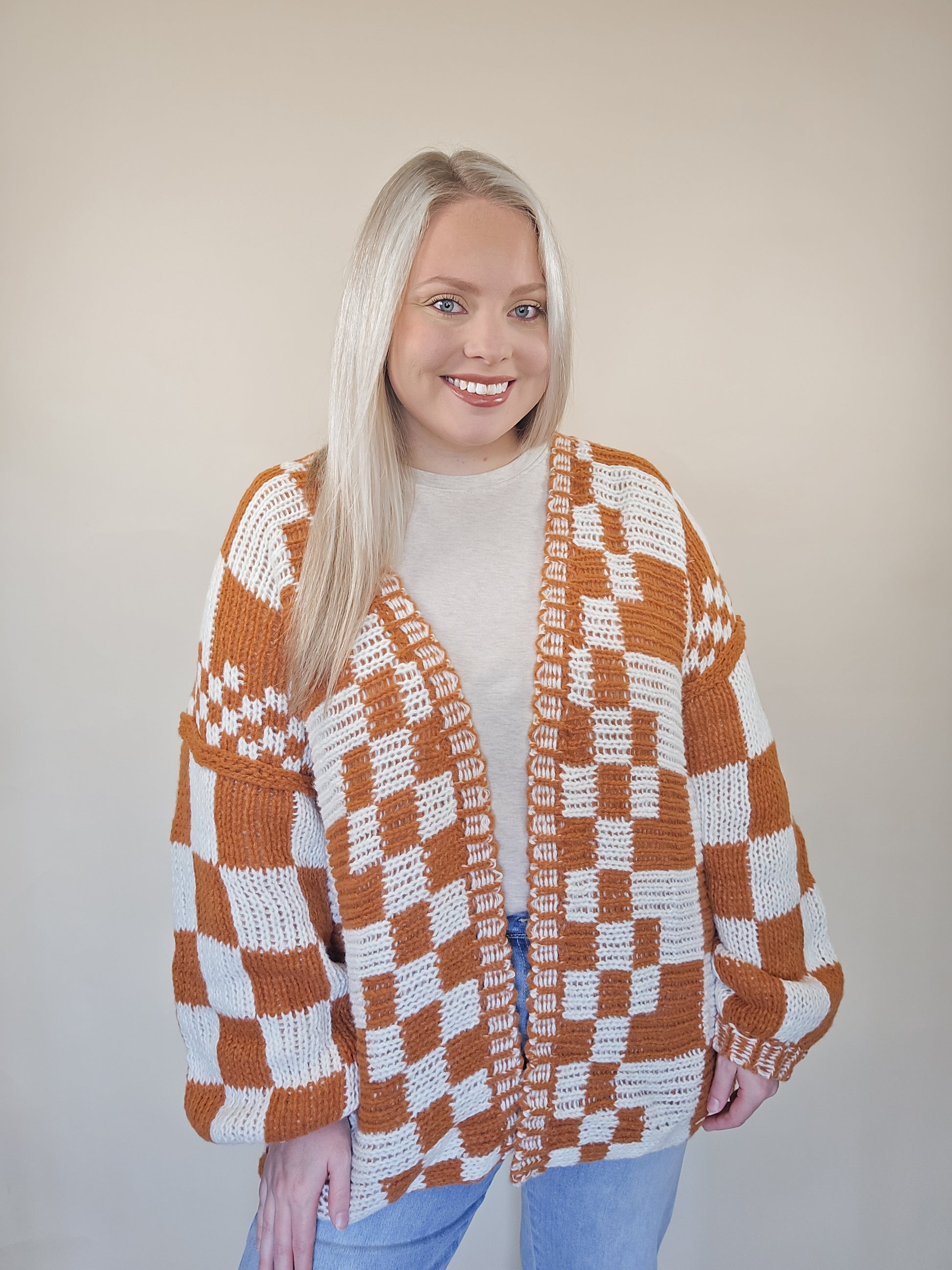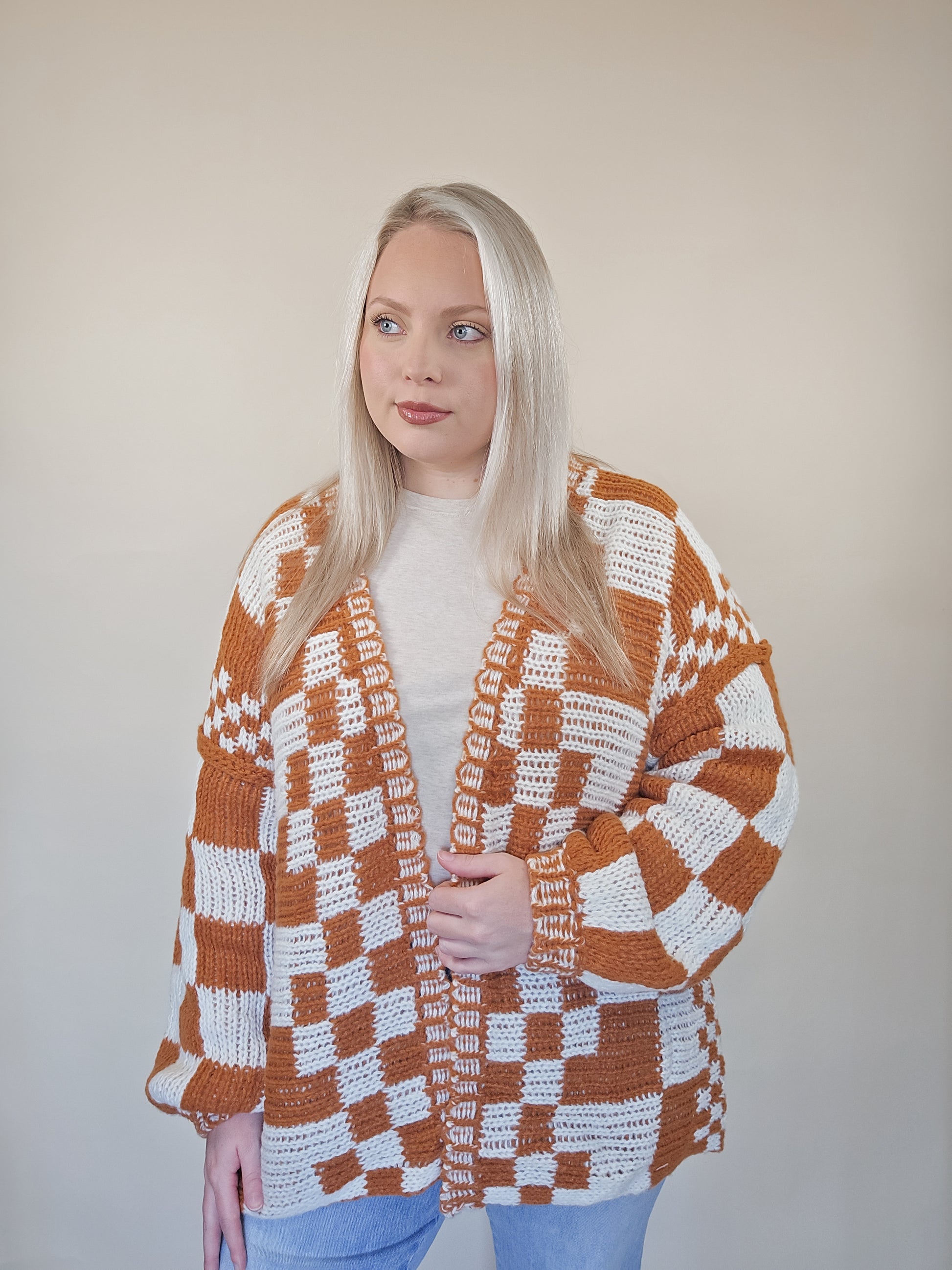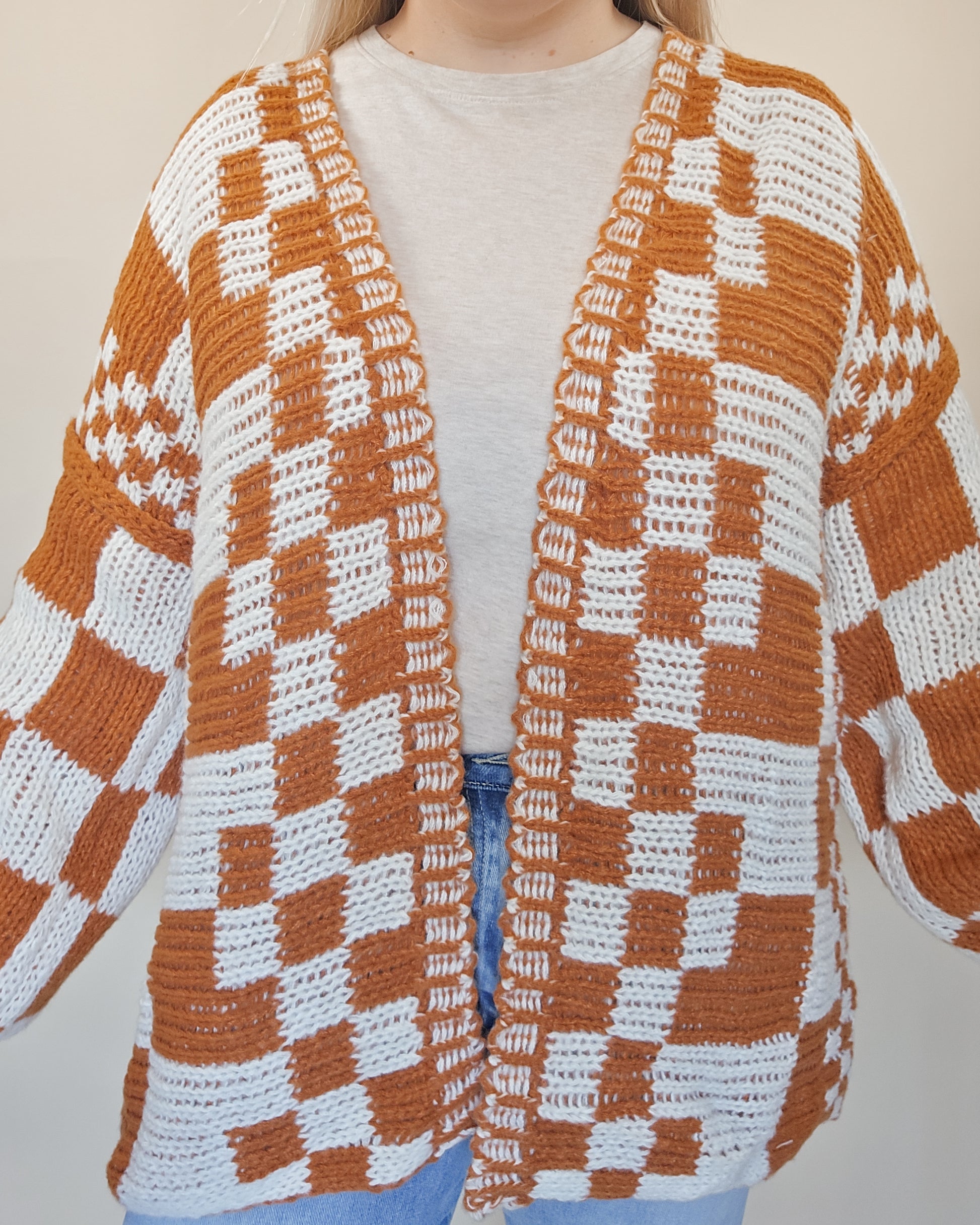 Oversized chunky knit crochet cardigan. Features balloon sleeves with a mixed checkered pattern.
